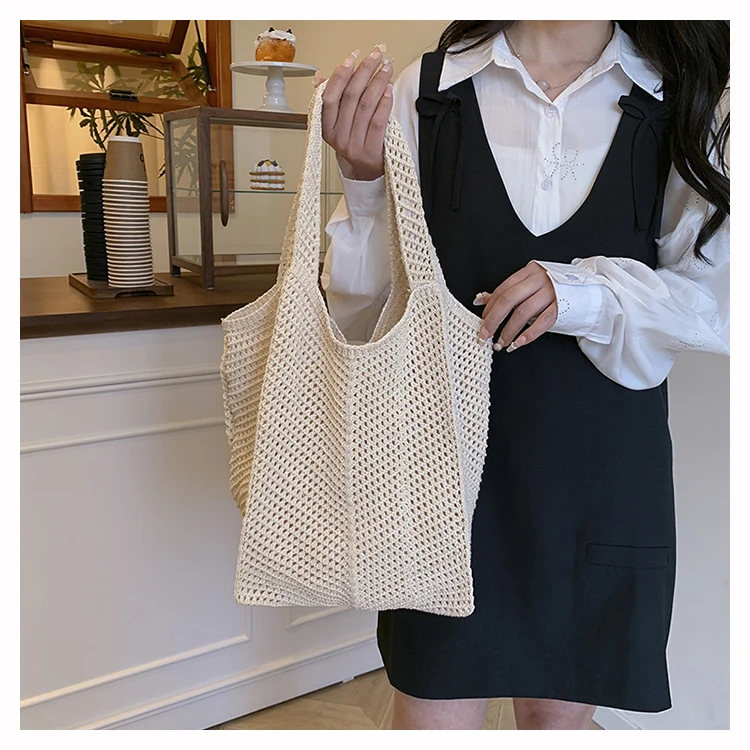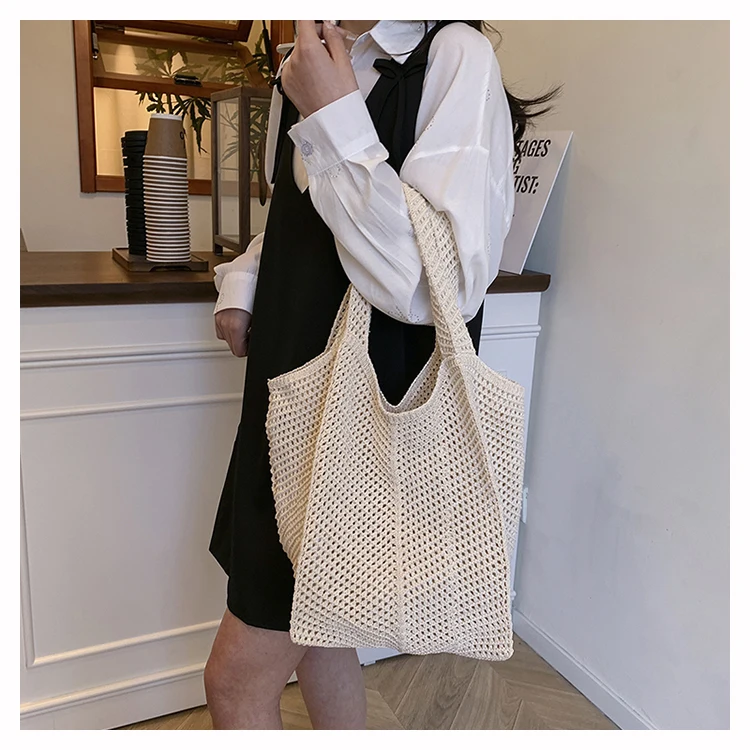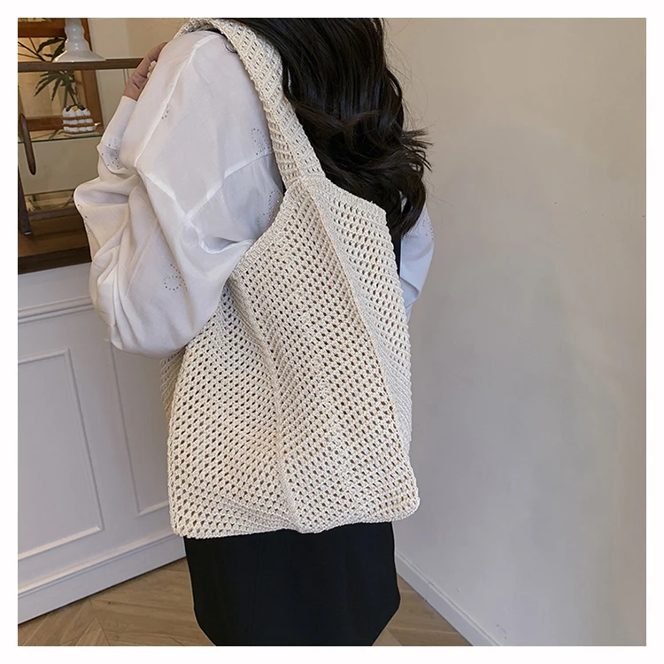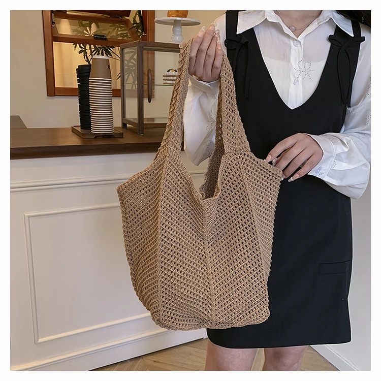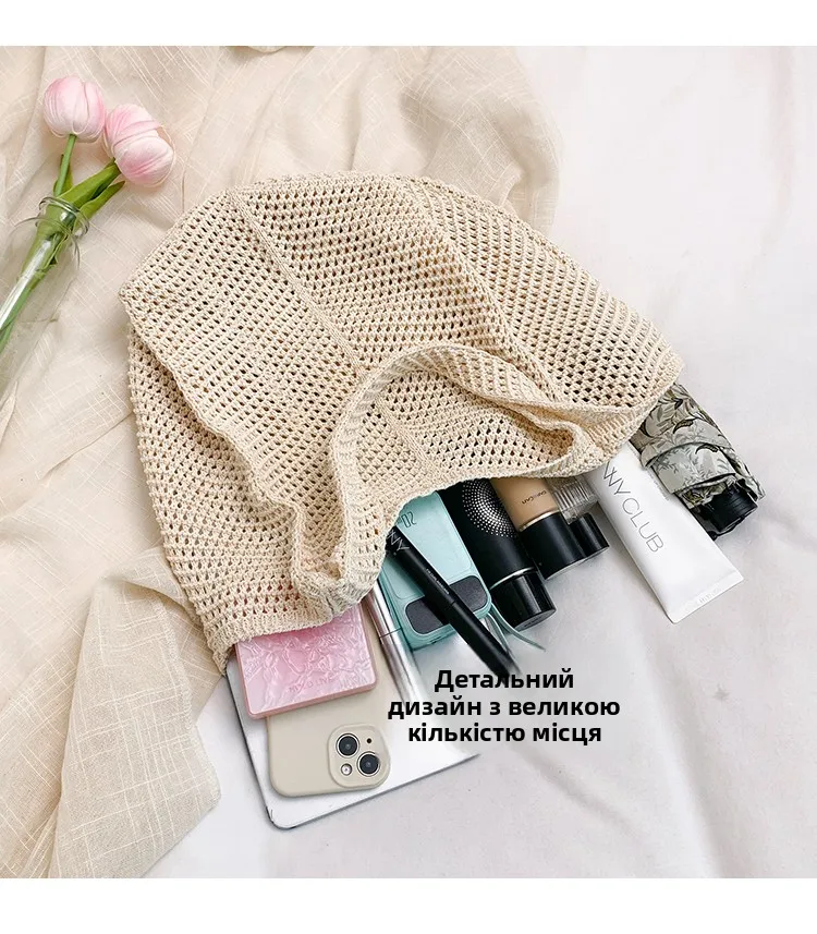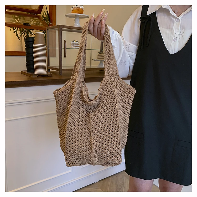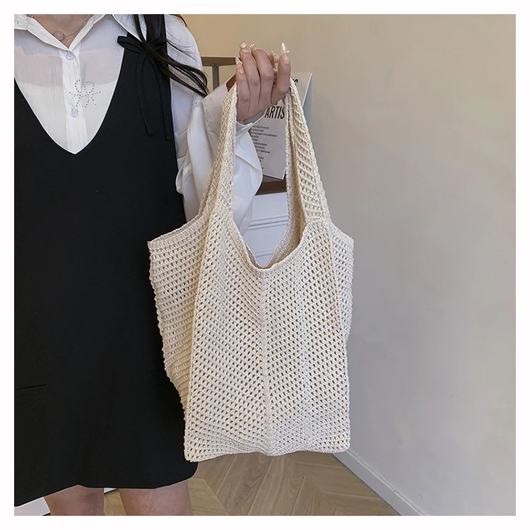 - حقيبة شاطئية عصرية مطرزة يدويًا بتصميم ريترو، حقيبة كتف واحدة من القماش الناعم بدون إغلاق، مقاس متوسط للشباب.