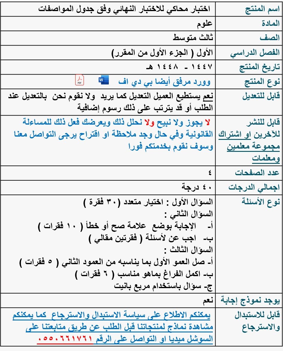 اختبار محاكي نهائي وفق جدول المواصفات مع نموذج إجابة علوم ثالث متوسط الجزء الأول من المقرر