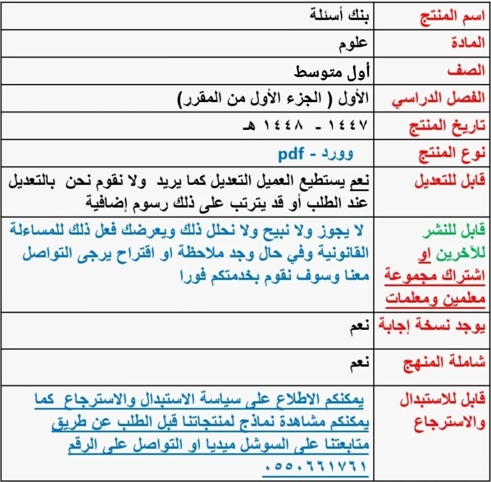 بنك لأهم أسئلة علوم أول متوسط شاملة المنهج الجزء الأول من المقرر