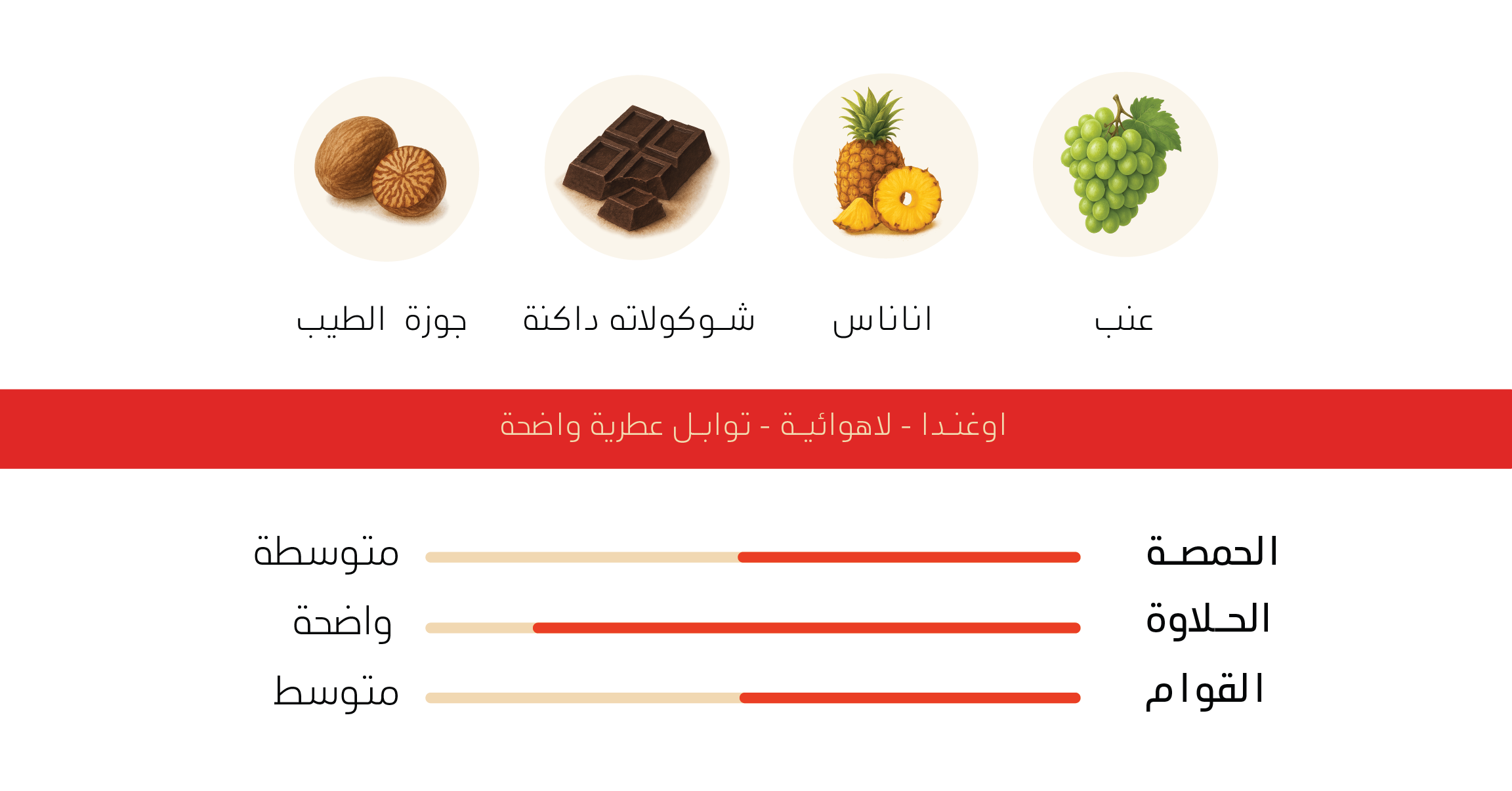 قهوة اوغندية لاهوائية بنكهة فاكهية غنية وحلاوة عالية مع قوام متوسط. مناسبة لعشاق القهوة ذات الطابع العصيري والفلتر المميز.