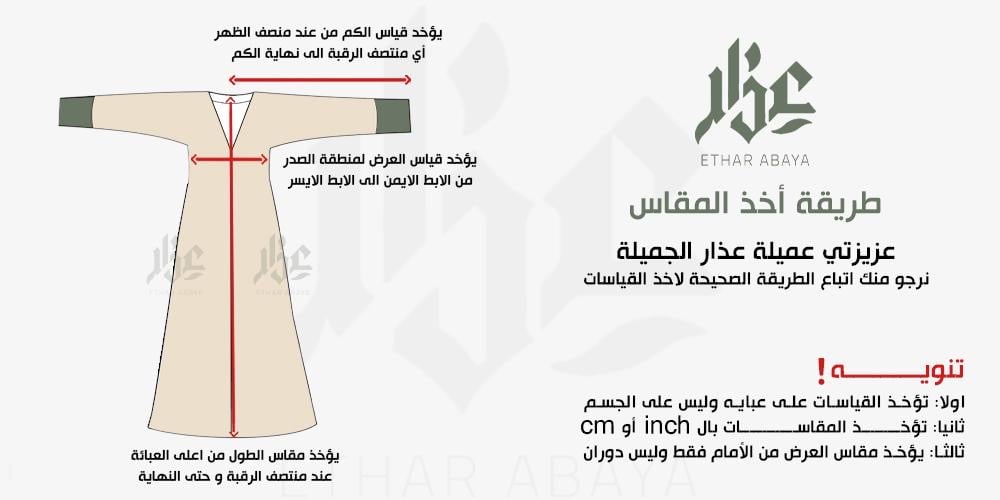 في عذار يسعدنا أن نقدم لكنّ أرقى وأجود العباءات من حيثُ اختيار أفضل الأقمشة، والدقة في الخياطة والتفصيل. كما أننا نراعي في اختلاف القياسات لذلك فإن جميع العباءات تُفصل حسب قياسات العميلة.