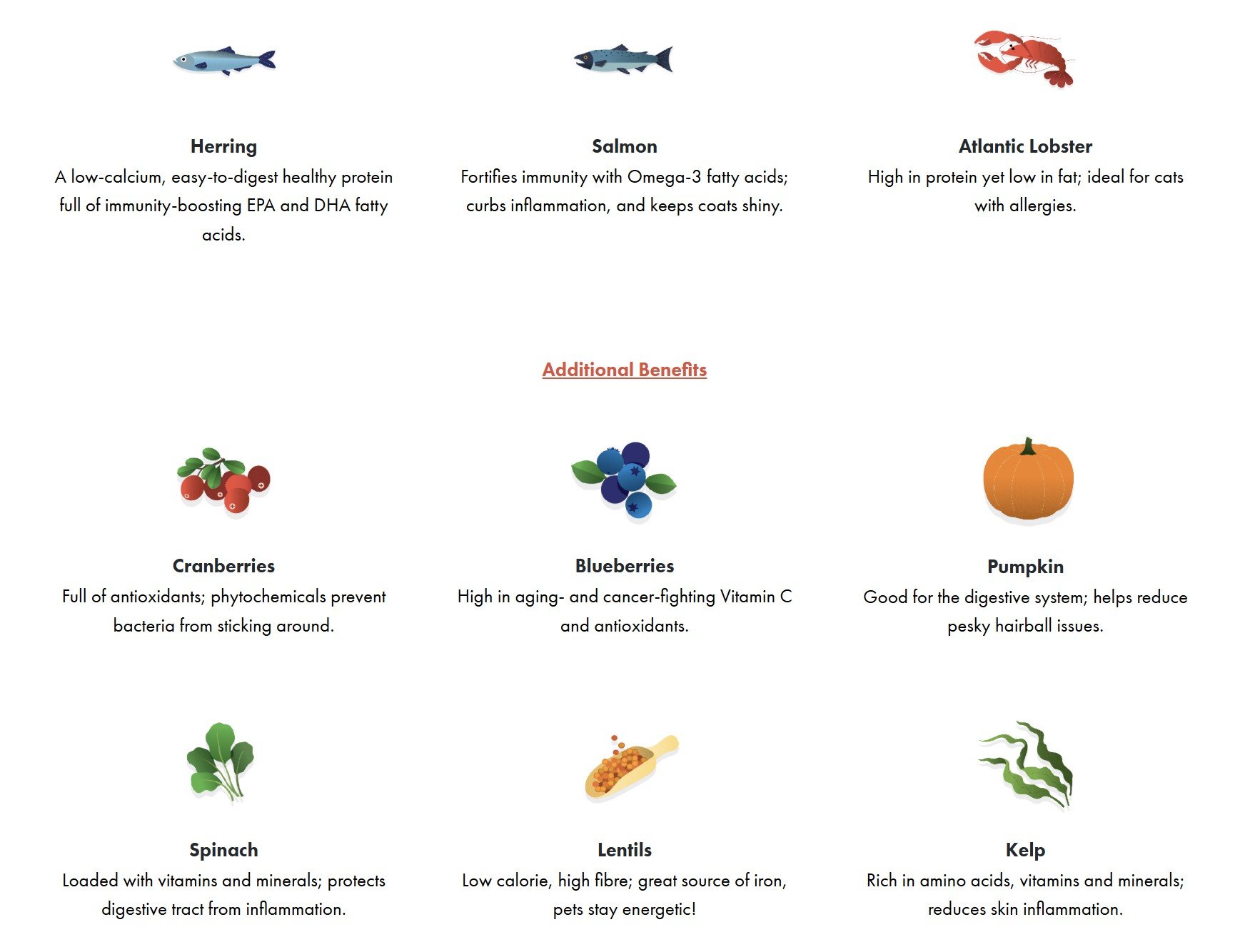 وجبة رنجة (Herring Meal)، عدس، بازلاء، زيت رنجة (Herring Oil)، وجبة سالمون، وجبة كركند بحر أطلسي (Lobster Meal)، لب حمضيات، ملح، كولين كلورايد، فوسفات أحادي الكالسيوم، وجبة أعشاب بحرية (Kelp Meal)، تورين، حمض الستريك، مكملات الزنك والحديد والنحاس والمنغنيز واليود والسيلينيوم، مزيج فيتامينات (A, D3, E, B-Complex، حمض الفوليك، البيوتين)، ليسين، ميثيونين، ليسيثين، بالإضافة إلى التوت الأزرق، التوت البري، اليقطين، السبانخ، الزنجبيل، النعناع، وبروبيوتيك Bacillus licheniformis وBacillus subtilis.