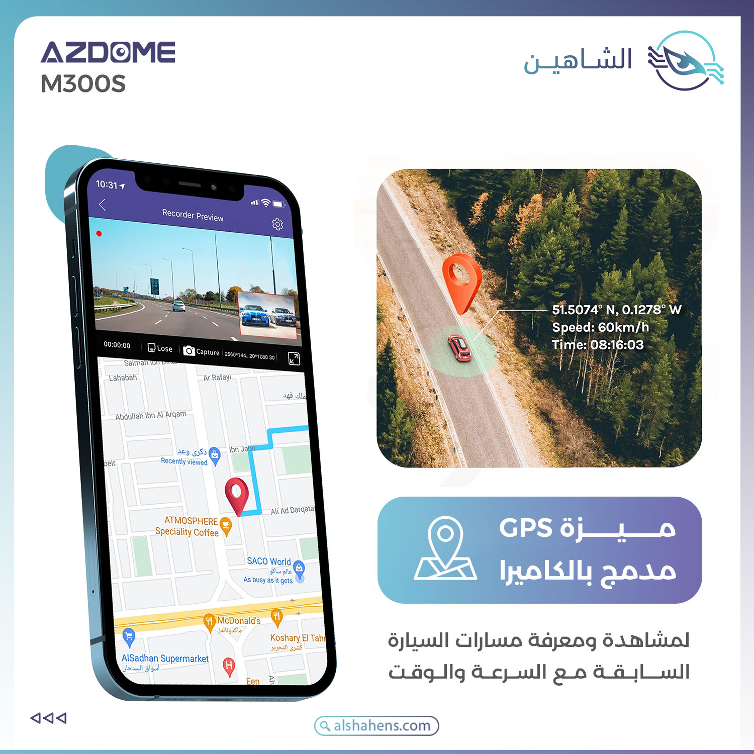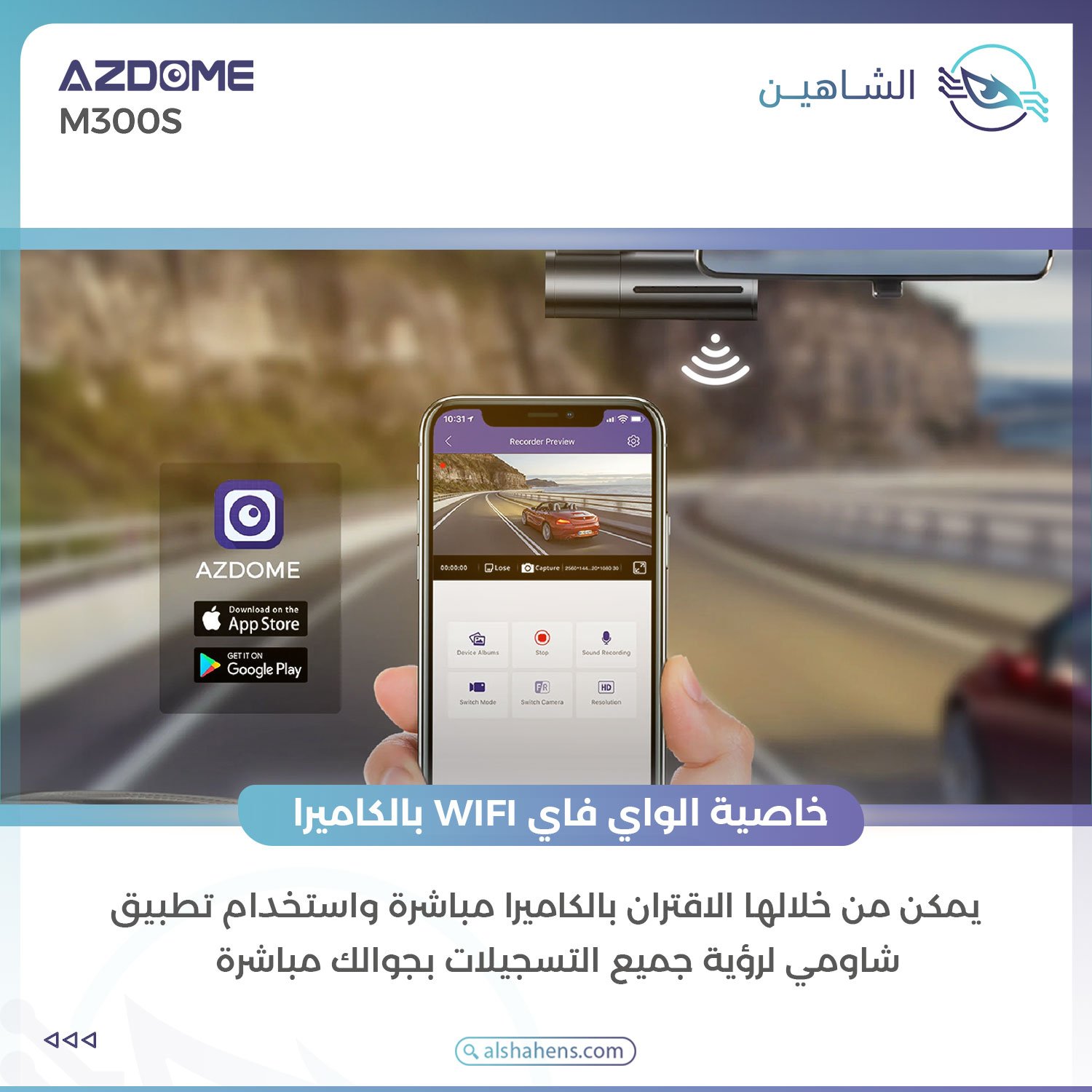 يمكن من خلالها الاقتران بالكاميرا مباشرة واستخدام تطبيق azdome لرؤية جميع التسجيلات بجوالك مباشرة دون الحاجة لإخراج الذاكرة من الكاميرا، بالإضافة الى رؤية بيانات الGPS والتحكم بإعدادات الكاميرا.