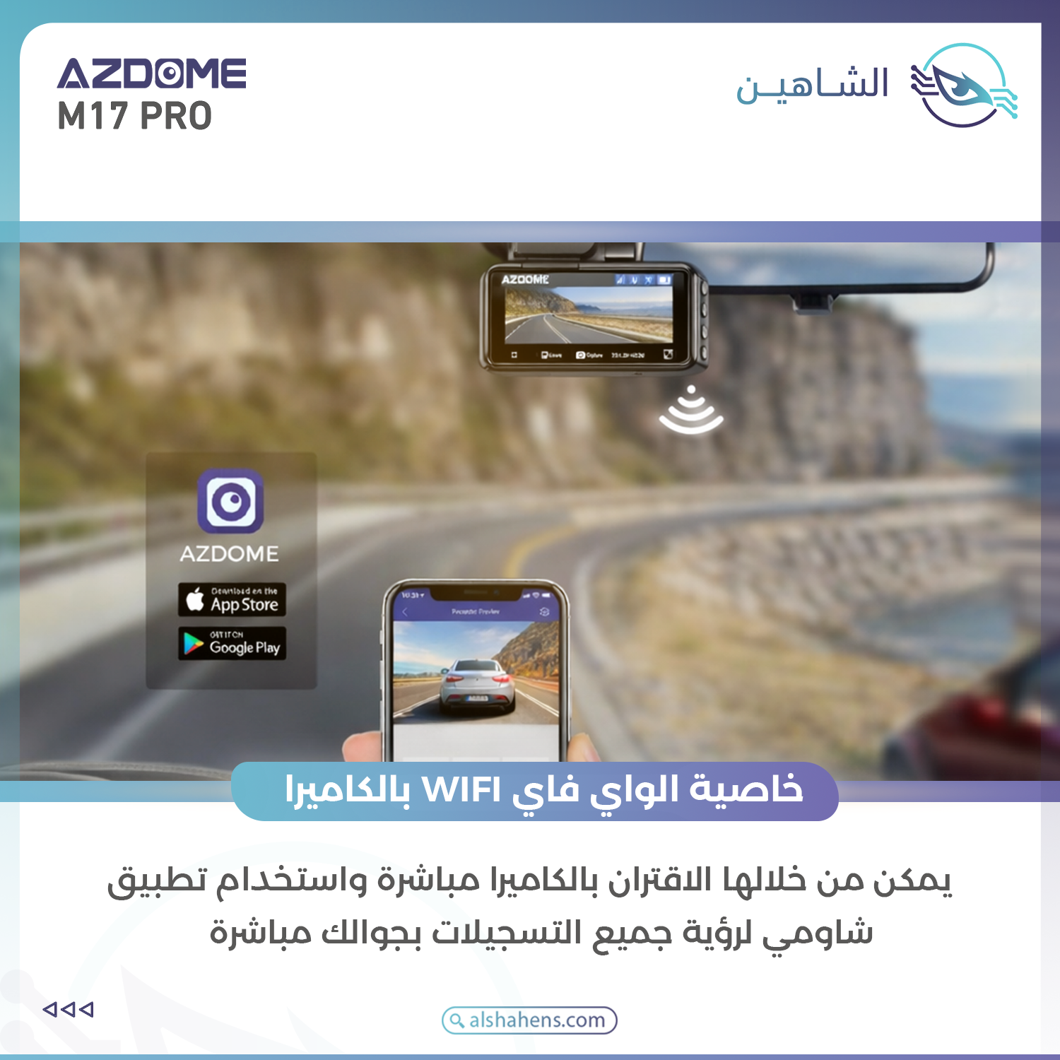 يمكن من خلالها الاقتران بالكاميرا مباشرة واستخدام تطبيق azdome لرؤية جميع التسجيلات بجوالك مباشرة دون الحاجة لإخراج الذاكرة من الكاميرا، بالإضافة الى رؤية بيانات الGPS والتحكم بإعدادات الكاميرا.