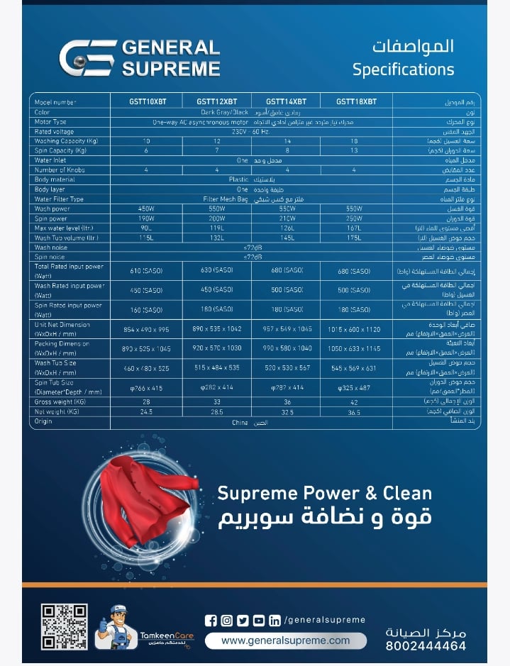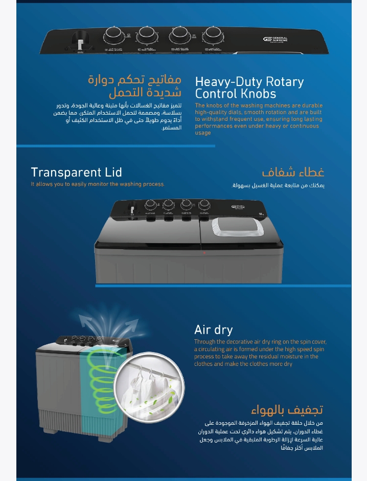 - GSTT10XTB جنرال سوبريم غسالة نصف اوتوماتيك حوضين 10 كيلو,رمادي غامق / اسود, GSTT10XTBGSTT10XTB General Supreme Semi-Automatic Twin Tub Washing Machine, 10 kg, Dark Gray/Black, GSTT10XTB