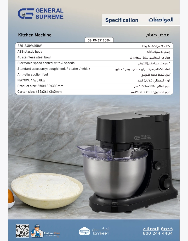 GSKM651000M جنرال سوبريم عجانة سعة 4 لتر، 6 سرعات، 600 واط، اسودGSKM651000M General Supreme 4L Stand Mixer, 6 Speeds, 600W, Black