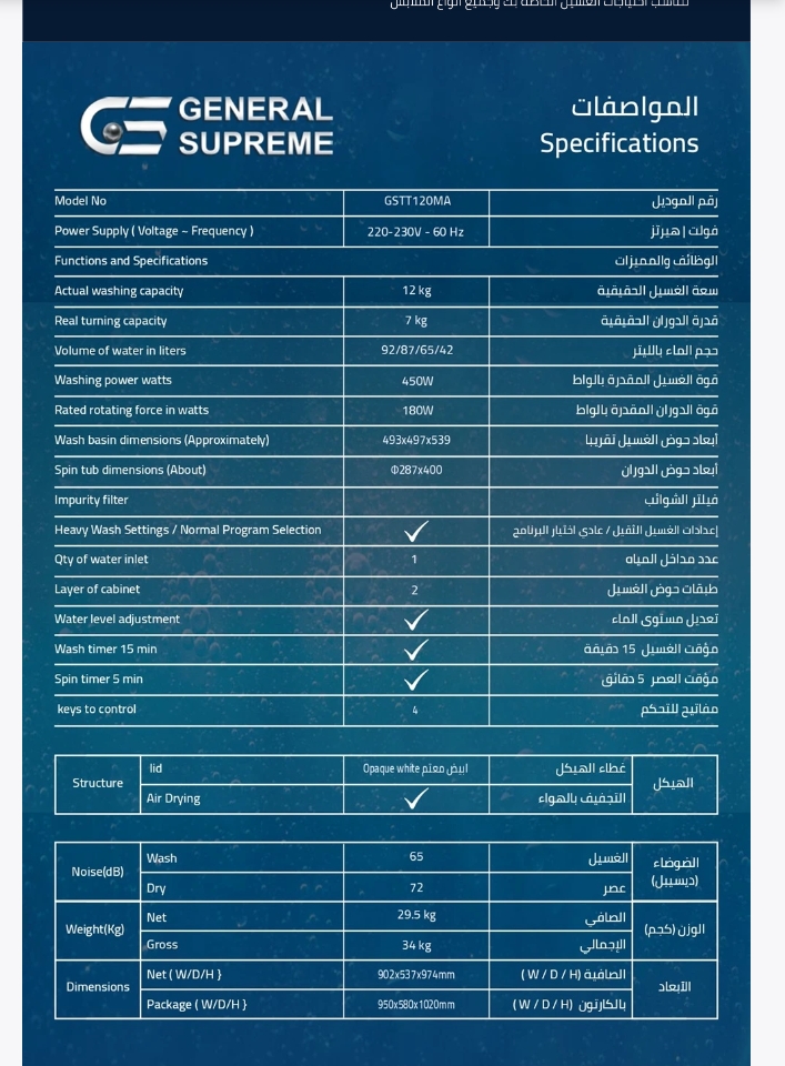 - GSTT120MA جنرال سوبريم غسالة نصف اوتوماتيك حوضين 12 كيلو, أبيض, GSTT120MA (1)GSTT120MA General Supreme Semi-Automatic Twin Tub Washing Machine, 12 kg, White, GSTT120MA (1)