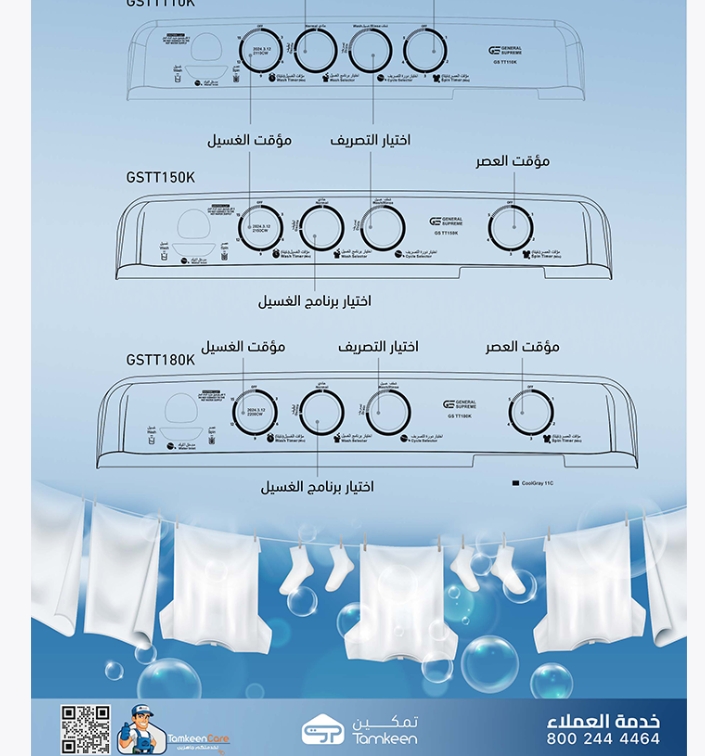 - GSTT110K جنرال سوبريم غسالة نصف اوتوماتيك حوضين 11 كيلوأبيض/أزرقGSTT110K General Supreme Semi-Automatic Twin Tub Washing Machine, 11 kg, White/Blue