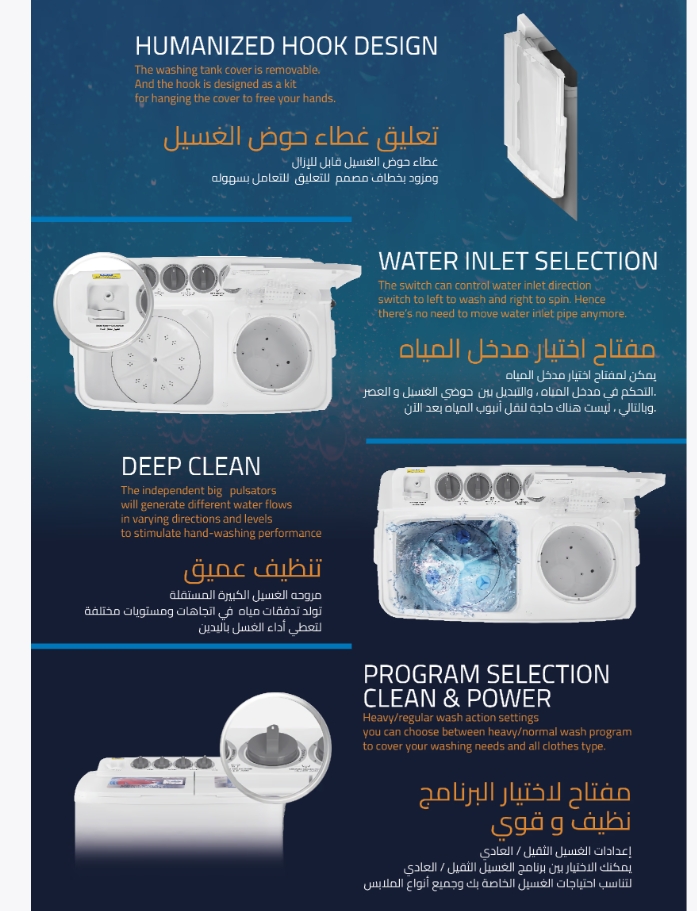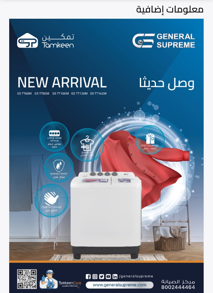 - GSTT90XW جنرال سوبريم غسالة نصف اوتوماتيك حوضين 9 كيلو, أبيض, GSTT90XWGSTT90XW General Supreme Semi-Automatic Twin Tub Washing Machine, 9 kg, White, GSTT90XW