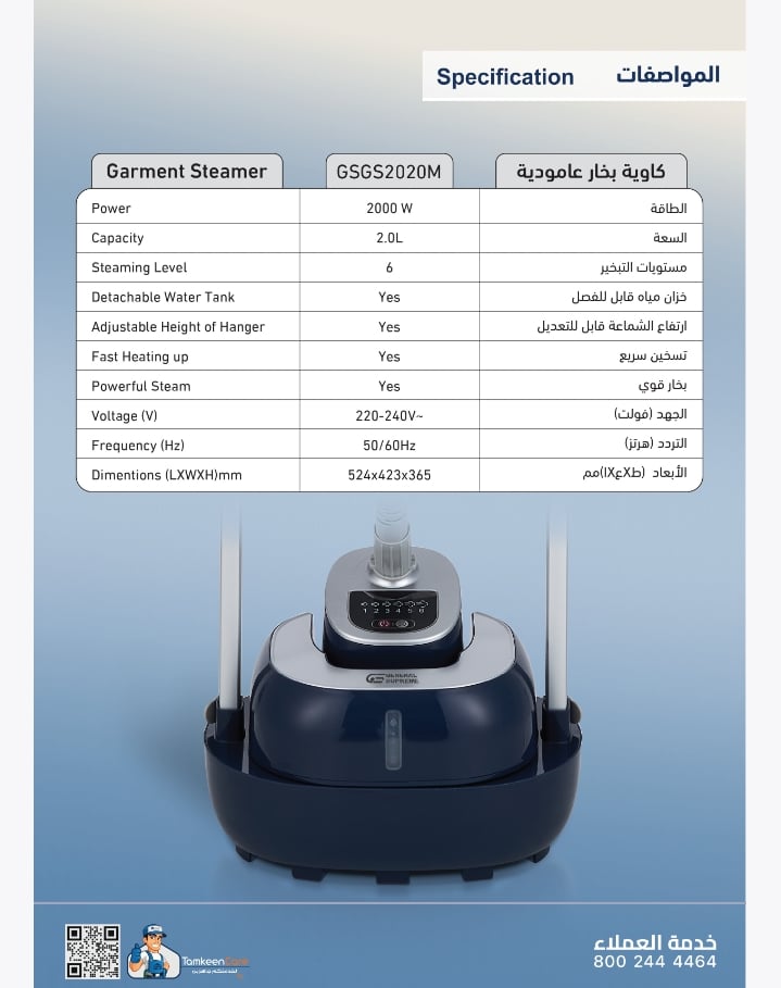 - GSGS2020M جنرال سوبريم كاوية عامودية مع مسند مدمج للكي بقدرة 2000 واط، أزرقGSGS2020M General Supreme Vertical Iron with Built-in Ironing Board, 2000W, Blue