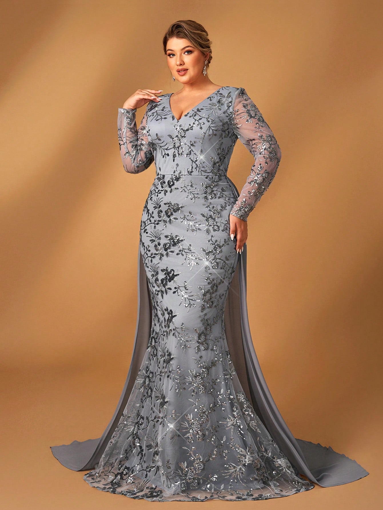 فستان سهرة طويل للمرأة البدينة أنيق وفاخر باللون الرمادي اللامع مرصع بالترتر، بياقة على شكل حرف V وأ