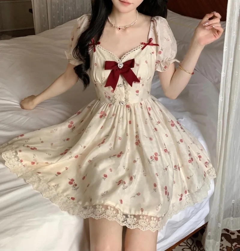 فستان أميرات نسائي بالأزهار فستان بفيونكة حمراء دانتيل فساتين أنيقة موضة فرنسية صيفي جديد