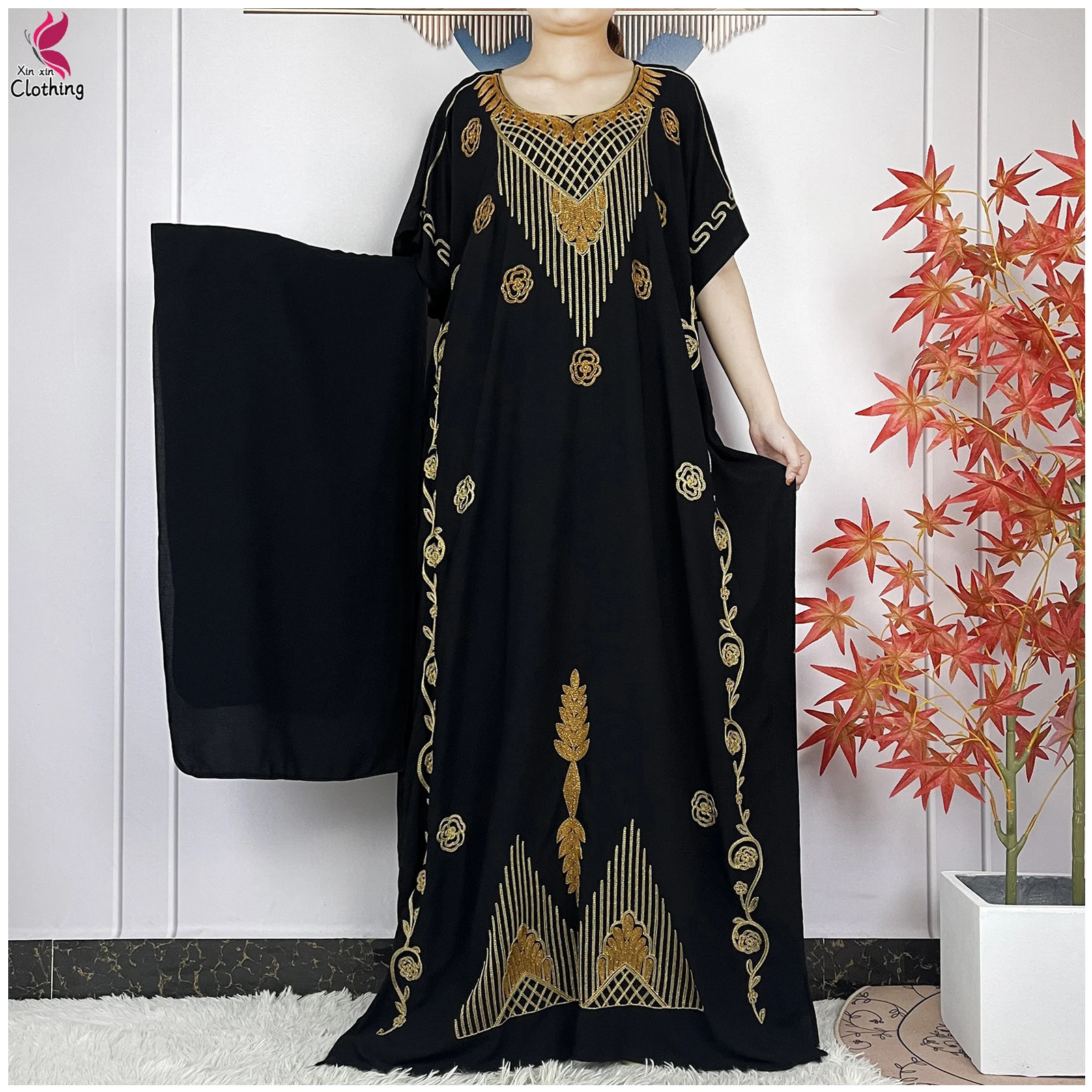 طقم فستان إسلامي بأكمام قصيرة للنساء ، رداء قطني فضفاض ، موضة إناث ، ملابس إسلامية مع حجاب ، عمامة ، تطريز ، سيدة ، نساء ، جديد