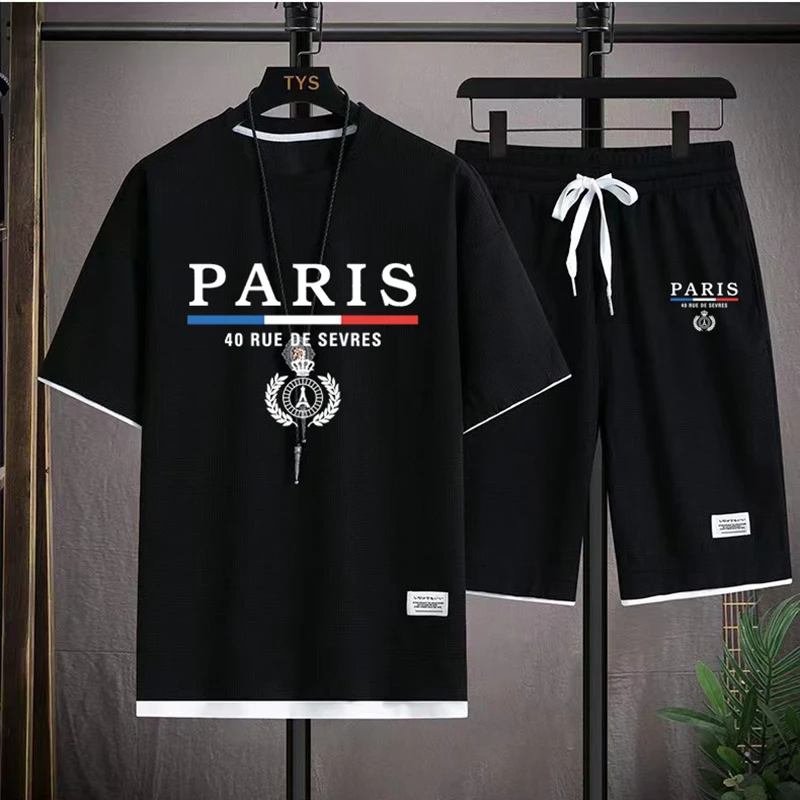 طقم تي شيرت باريس للرجال بدلة جافة سريعة التهوية فضفاضة صيفي