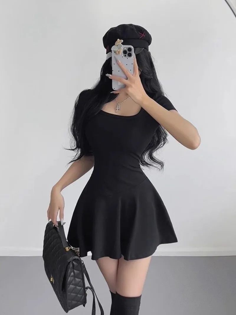 فستان نسائي قصير بياقة مربعة سوداء ، ملابس نسائية أنيقة وجميلة ، فستان بخصر ، الصيف