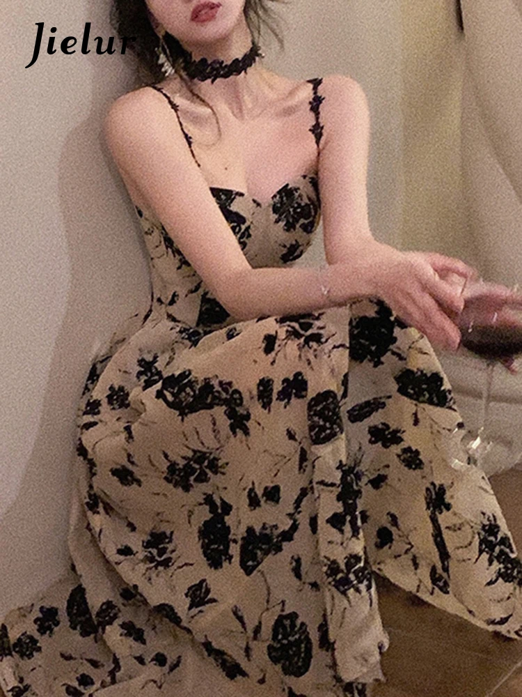 Jielur موضة 2023 بحزام منقوش عليه زهور فستان عتيق أنيق بدون أكمام للحفلات المسائية موضة