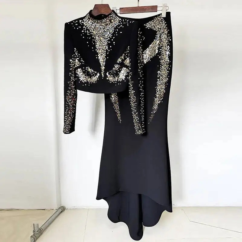 الفاخرة الترتر 2 قطعة مجموعة المرأة طويلة الأكمام سترة معطف حورية البحر ذيل السمكة ماكسي التنانير دعوى 2 قطعة وتتسابق فساتين السهرة الرسمية