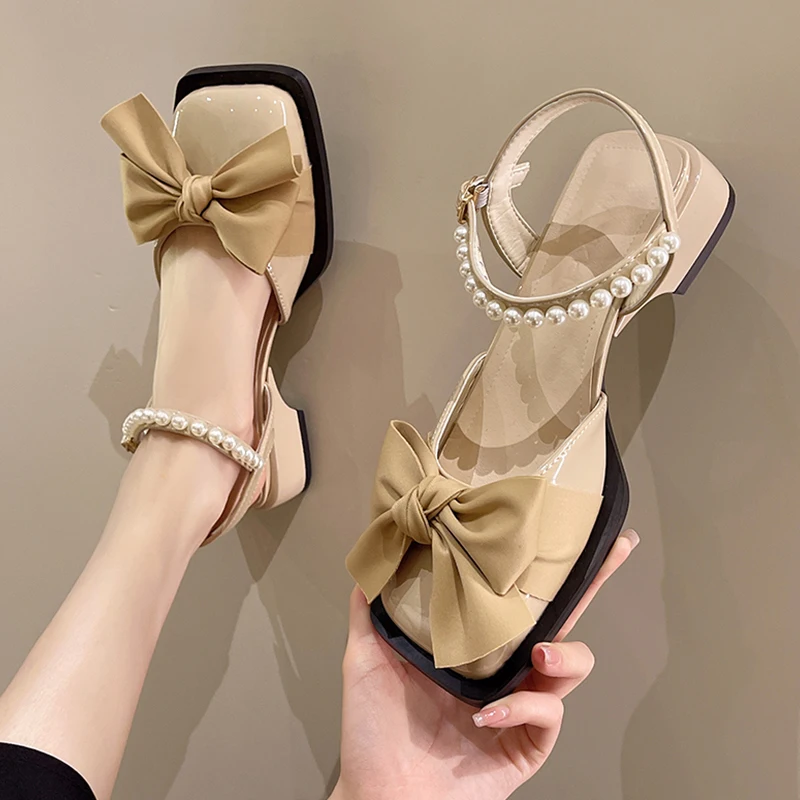 أحذية مريحة للنساء صنادل فاخرة تناسب الإناث البيج كتلة الكعوب كل مباراة ميد الفم الضحلة ماري جين المضادة للانزلاق صيف 2025