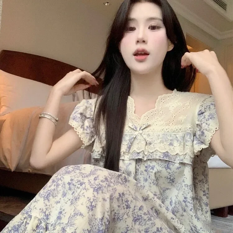 2024 الصيف المرأة ثوب النوم الدانتيل قصيرة الأكمام الحلو فستان طويل ملابس خاصة رقيقة Homewear فستان طويل نمط القصر
