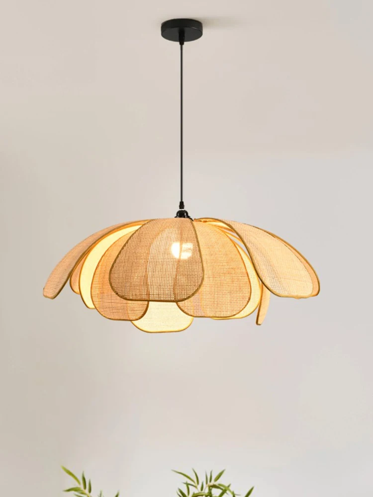 الثريا المصنوعة يدويًا من الروطان الطبيعي بتصميم البتلة، المستوحاة من الطراز الريفي والياباني-الآسيوي، تضفي جوًا فنيًا مميزًا على غرف الطعام والنوم.