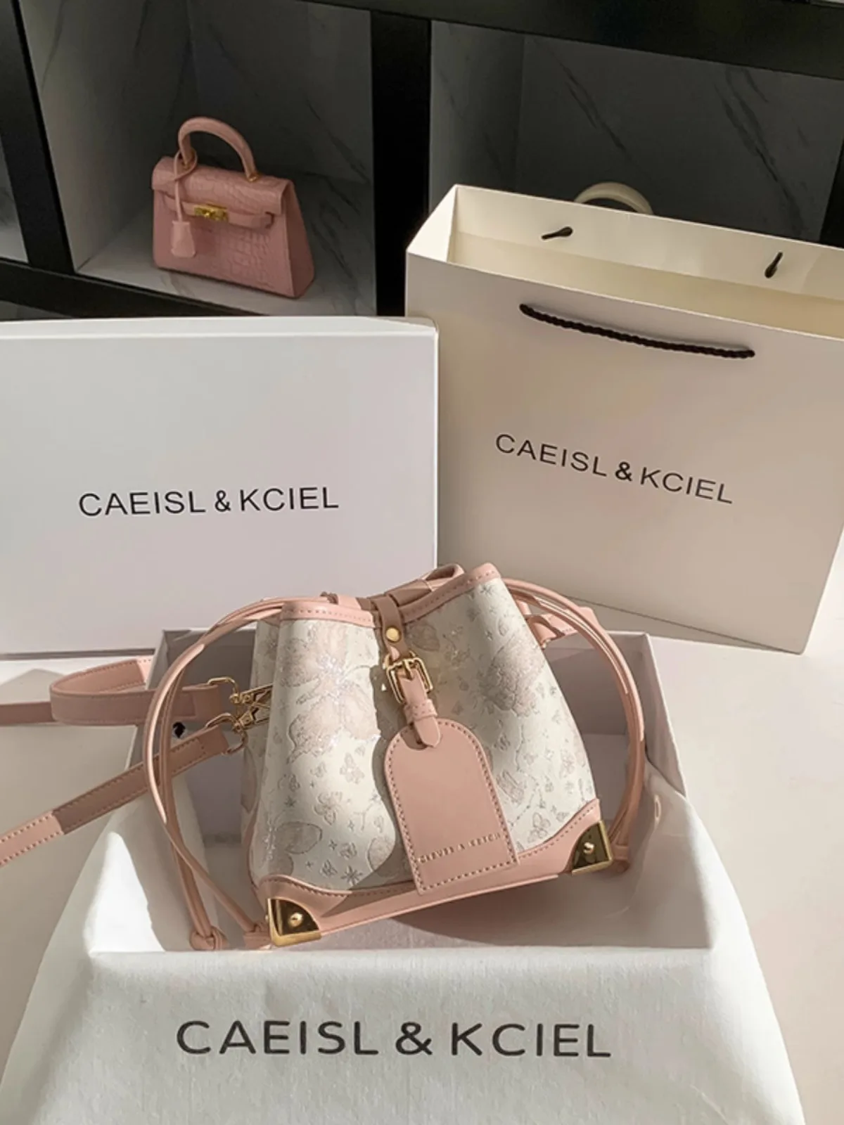 حقيبة دلو نسائية أنيقة باللون الوردي، تتميز بطبعة زهور جذابة وتطريز رقيق على شكل فراشات، وهي مثالية للاستخدام في المناسبات والحفلات.