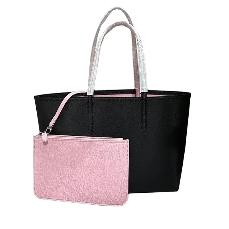 مجموعتان من حقائب اليد النسائية ذات السعة الكبيرة، مصنوعة من مادة البولي فينيل كلورايد (PVC)، مصممة كحقائب حمل وحقائب كتف للسفر والتسوق، مع مقبض علوي.
