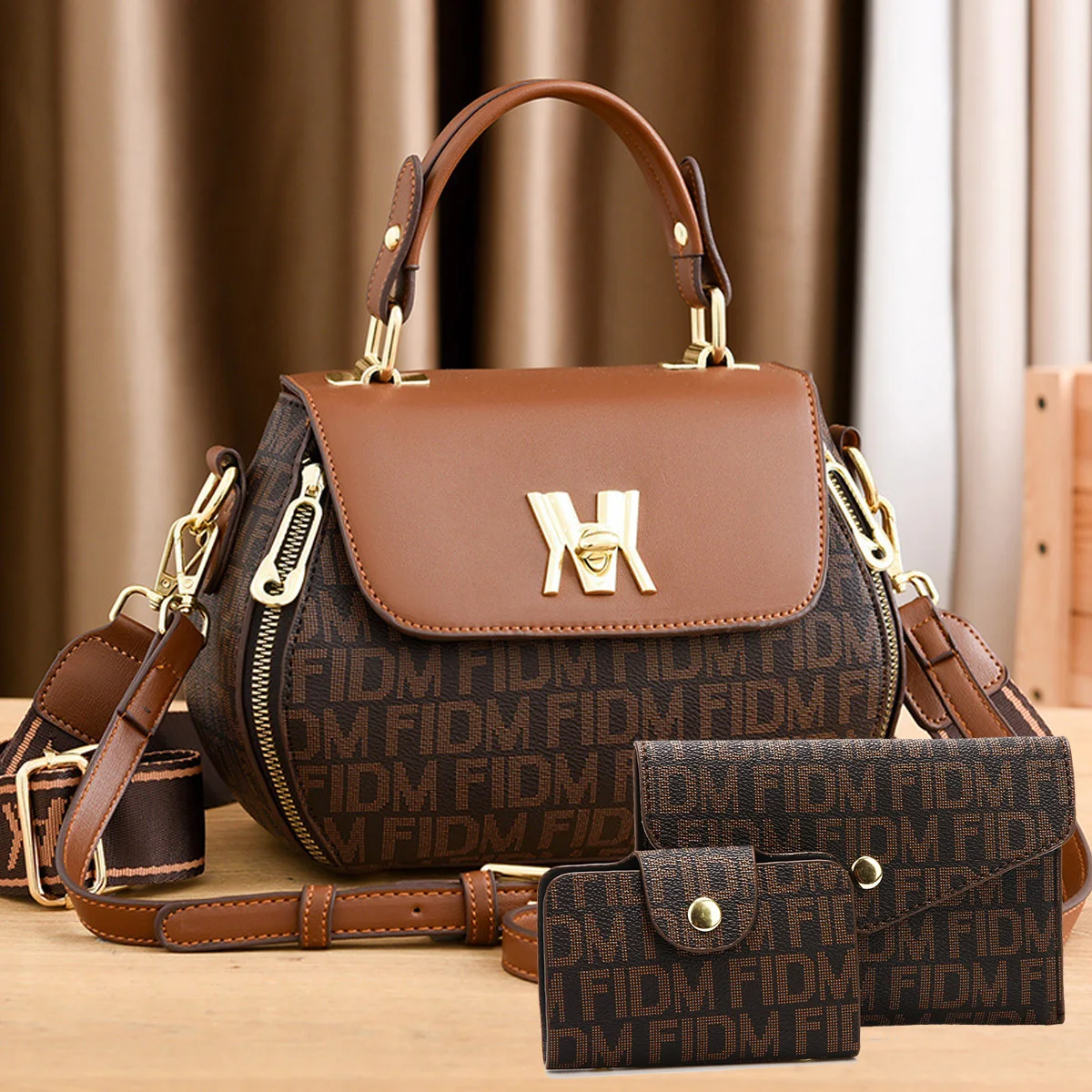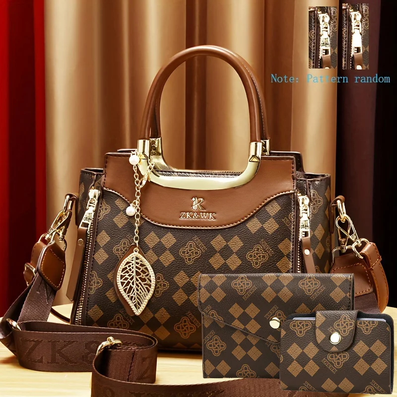 تشكيلة من 3 قطع من الحقائب النسائية الأنيقة، تتميز بتصميم هندسي مميز، وتشمل حقيبة يد من الجلد الصناعي، وحقيبة كروس، ومحفظة عملية.