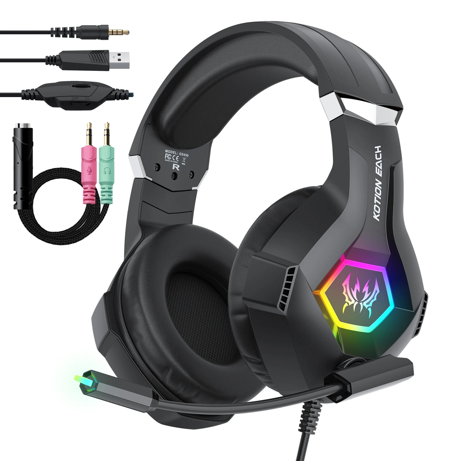 سماعة رأس سلكية مخصصة للألعاب مزودة بميكروفون بخاصية إلغاء الضوضاء، متوافقة مع أجهزة الكمبيوتر، بلايستيشن 4، بلايستيشن 5، وإكس بوكس، وتتميز بإضاءة RGB وتصميم يغطي الأذن.