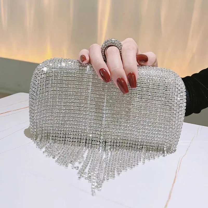 حقائب سهرة فاخرة بتصميم برّاق، مزينة بزخارف على شكل مخلب، مع أحجار الراين والماس، وحزام للكتف وسلسلة معدنية فضية.