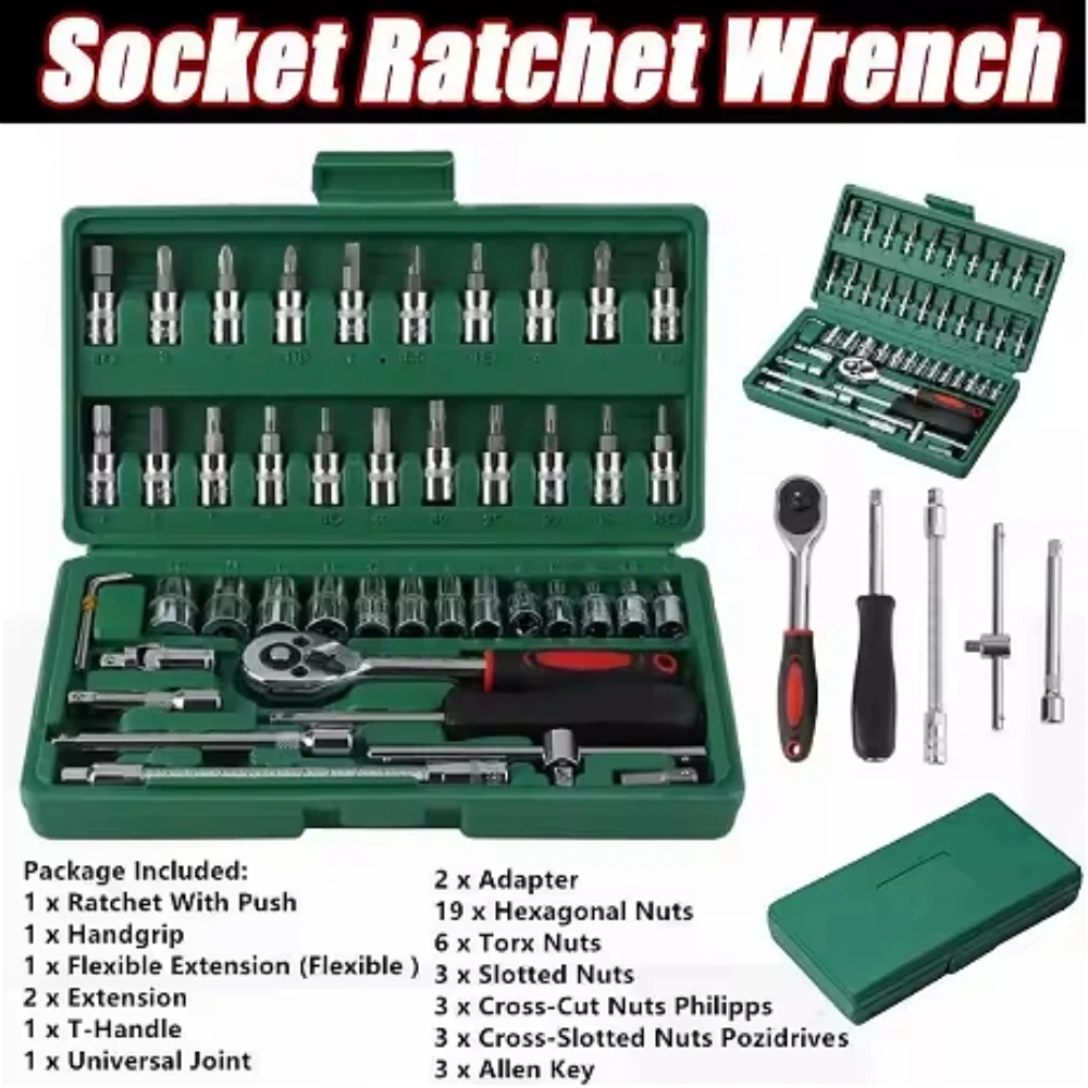 مجموعة أدوات إصلاح السيارات المكونة من 46 قطعة، مقاس 1/4 بوصة، تتضمن مجموعة من المقابس وأدوات اليد ومفتاح عزم الدوران، وهي مصممة خصيصًا للاستخدامات الميكانيكية والسيارات، وتتوافق مع المقاييس المترية.