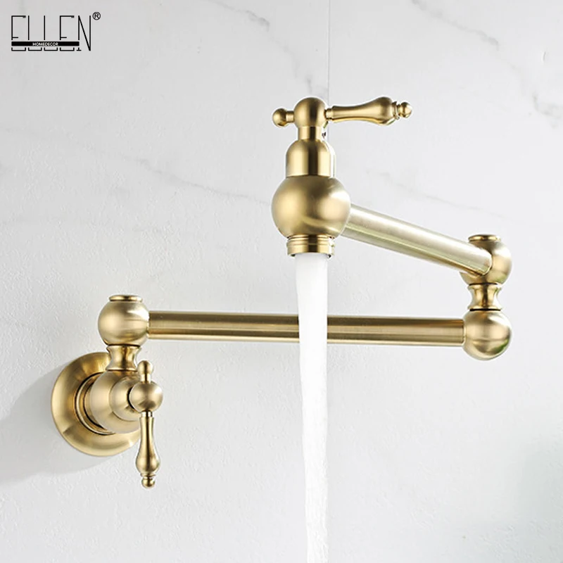 ELLEN صنبور مطبخ أسود بمقبض واحد من النحاس البارد، صنبور حوض ذهبي دوار 360 درجة قابل للطي عالمي مثبت على الحائط بفتحة مزدوجة من الكروم.