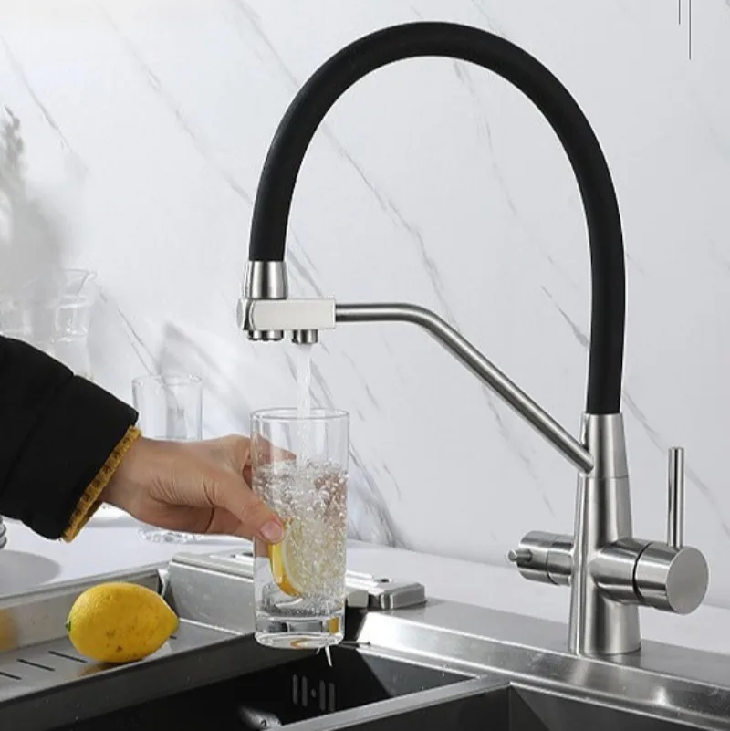 صنبور المطبخ 3 في 1، مصنوع من الفولاذ المقاوم للصدأ، يوفر مياه نقية وساخنة وباردة، ومزود بخرطوم سيليكون مرن، ومناسب للاستخدام في المطبخ والحمام.