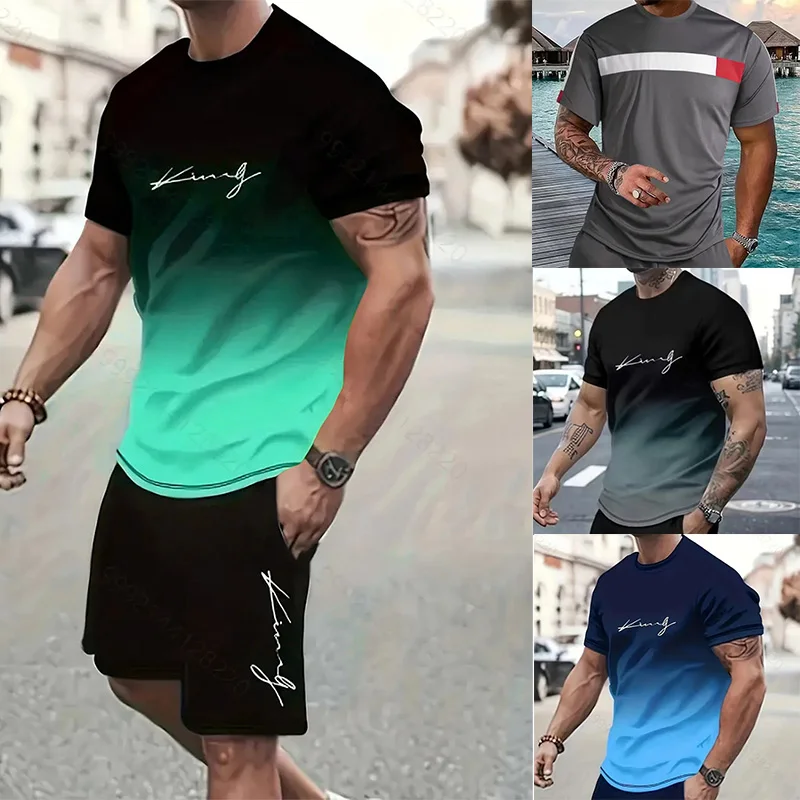 بدلة رياضية رقيقة مطبوعة للرجال ، طقم من قطعتين ، تي شيرت بأكمام قصيرة ، بنطلون ، كاجوال ، ملابس عصرية ، الصيف