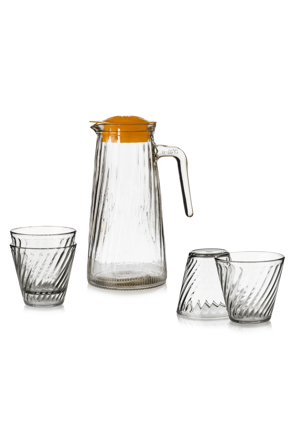 طقم مشروبات زجاجي 5 قطع – إبريق 1.5 لتر مع 4 أكواب 300 مل بتصميم أنيق