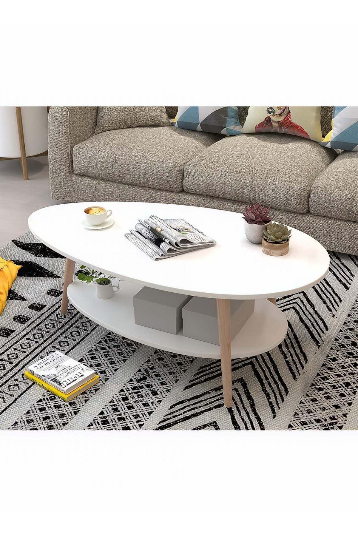 طاولة خشبية بيضاوية، طاولة بطبقتين للتخزين لغرفة المعيشة، طاولة قهوة 90×50×42 سم - أبيض