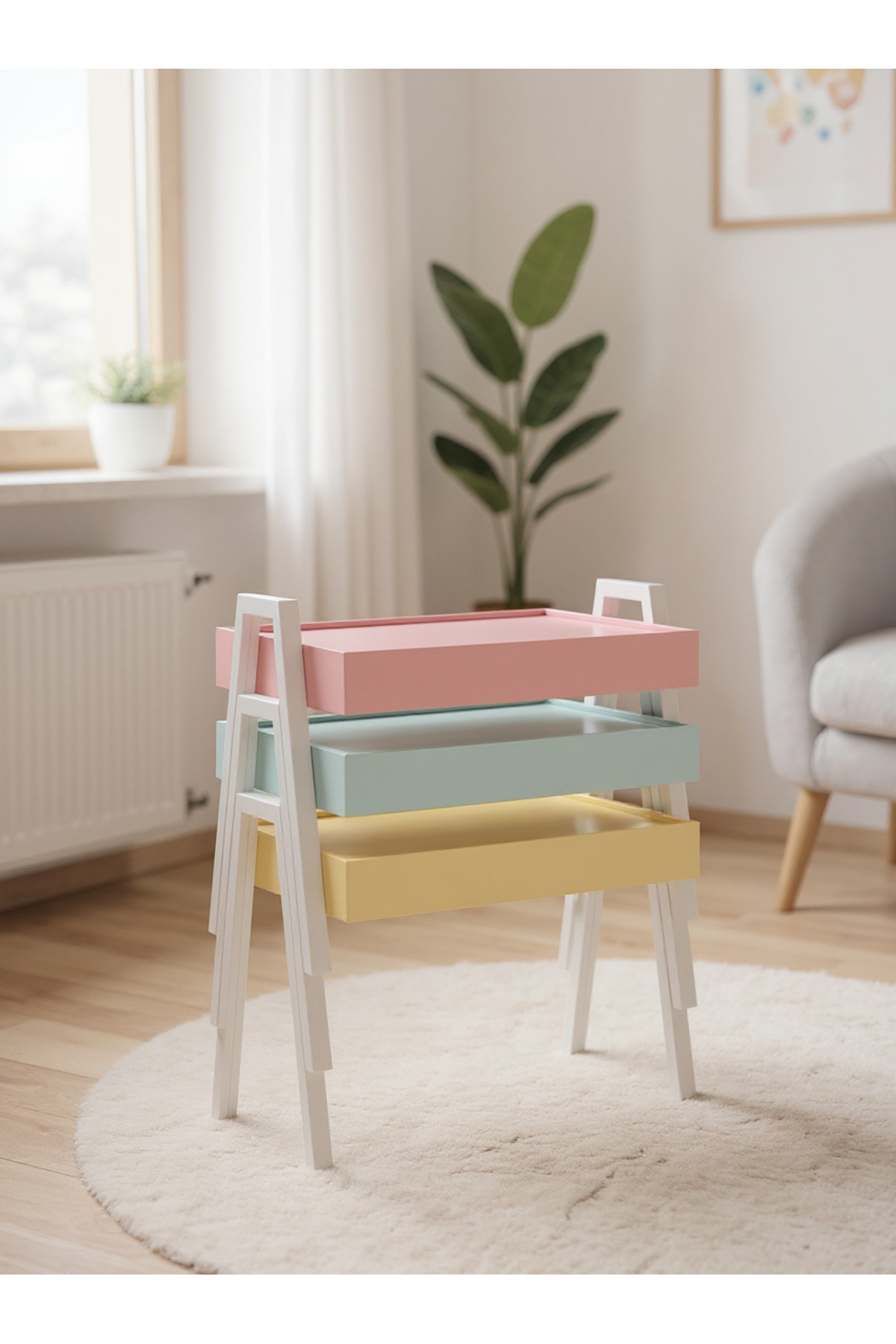 طقم طاولة خشبية ملونة 3 قطع – تصميم أنيق وعصري موفر للمساحة