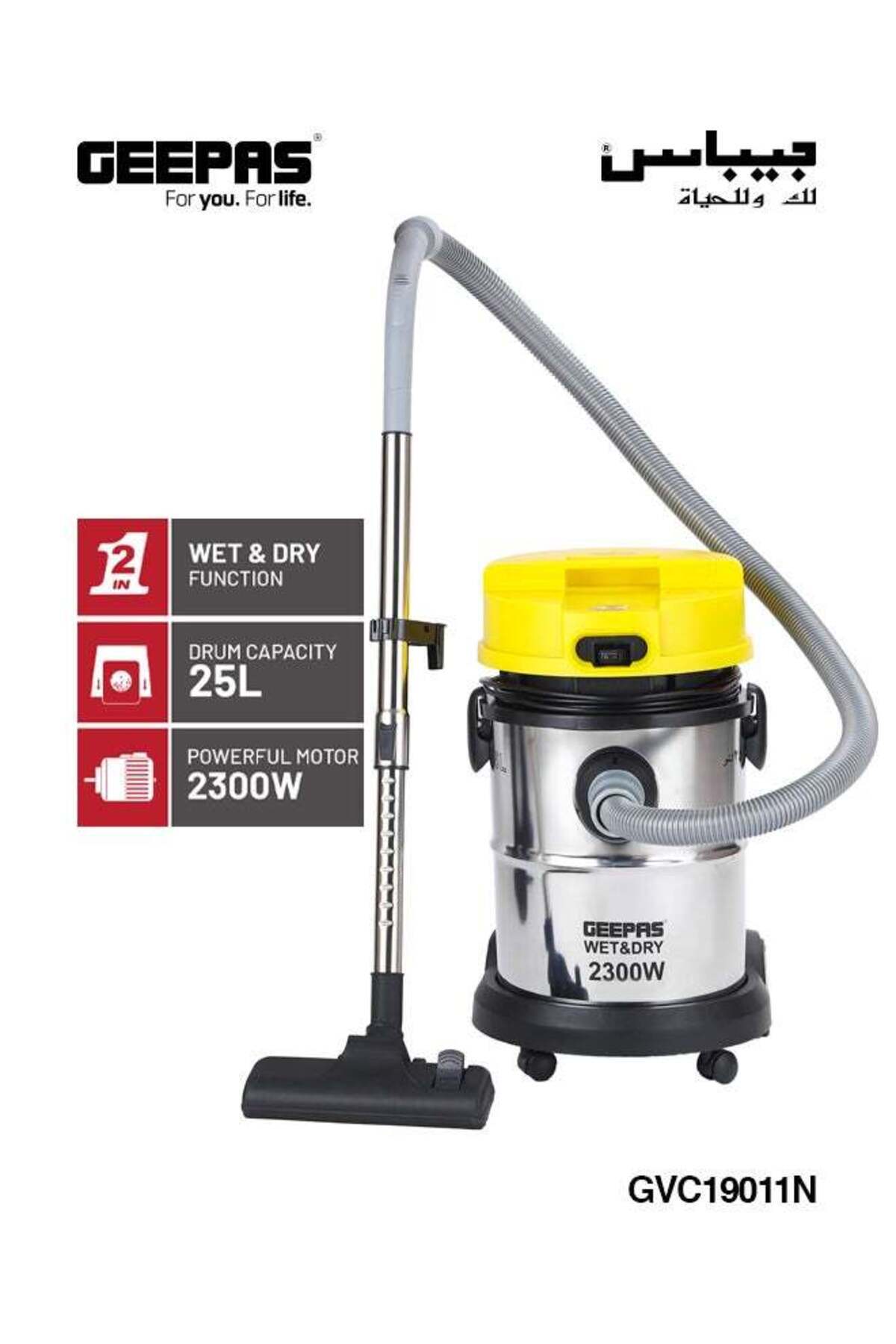 مكنسة جيباس كهربائية رطب وجاف ستانلس ستيل سعة 25 لتر بمقبض شفط قابل للتعديل